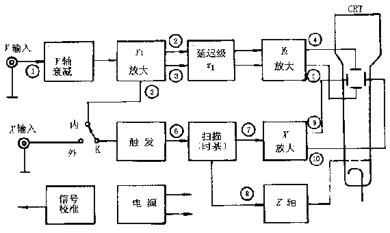 被測信號①接到“Y"輸入端經Y軸衰減器適當衰減后送至Y1放大器(前置放大)推挽輸出信號②和③。經延遲級延遲Г1時間到Y2放大器。放大后產生足夠大的信號④和⑤加到示波管的Y軸偏轉板上。為了在屏幕上顯示出完整的穩(wěn)定波形將Y軸的被測信號③引入X軸系統(tǒng)的觸發(fā)電路在引入信號的正(或者負)極性的某一電平值產生觸發(fā)脈沖⑥啟動鋸齒波掃描電路(時基發(fā)生器)產生掃描電壓⑦。由于從觸發(fā)到啟動掃描有一時間延遲Г2為保證Y軸信號到達熒光屏之前X軸開始掃描Y軸的延遲時間Г1應稍大于X軸的延遲時間Г2。掃描電壓⑦經X軸放大器放大產生推挽輸出⑨和⑩加到示波管的X軸偏轉板上。z軸系統(tǒng)用于放大掃描電壓正程并且變成正向矩形波送到示波管柵極。這使得在掃描正程顯示的波形有某一固定輝度而在掃描回程進行抹跡。
